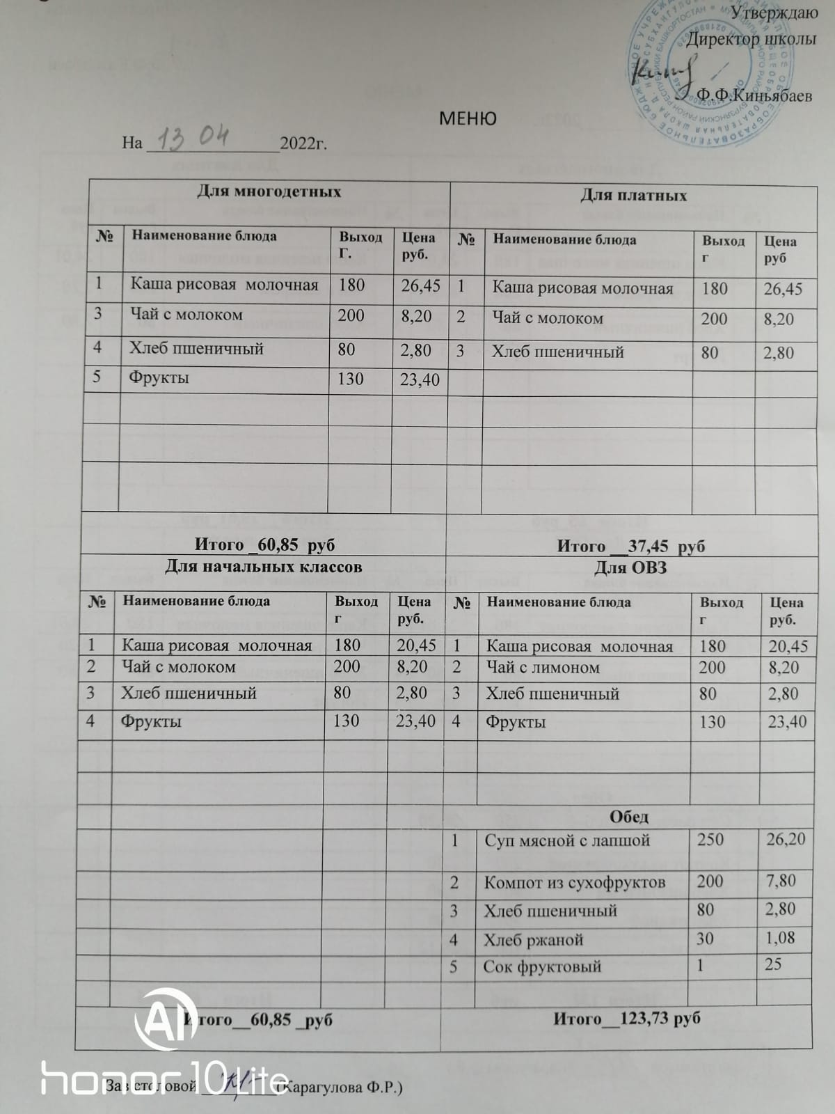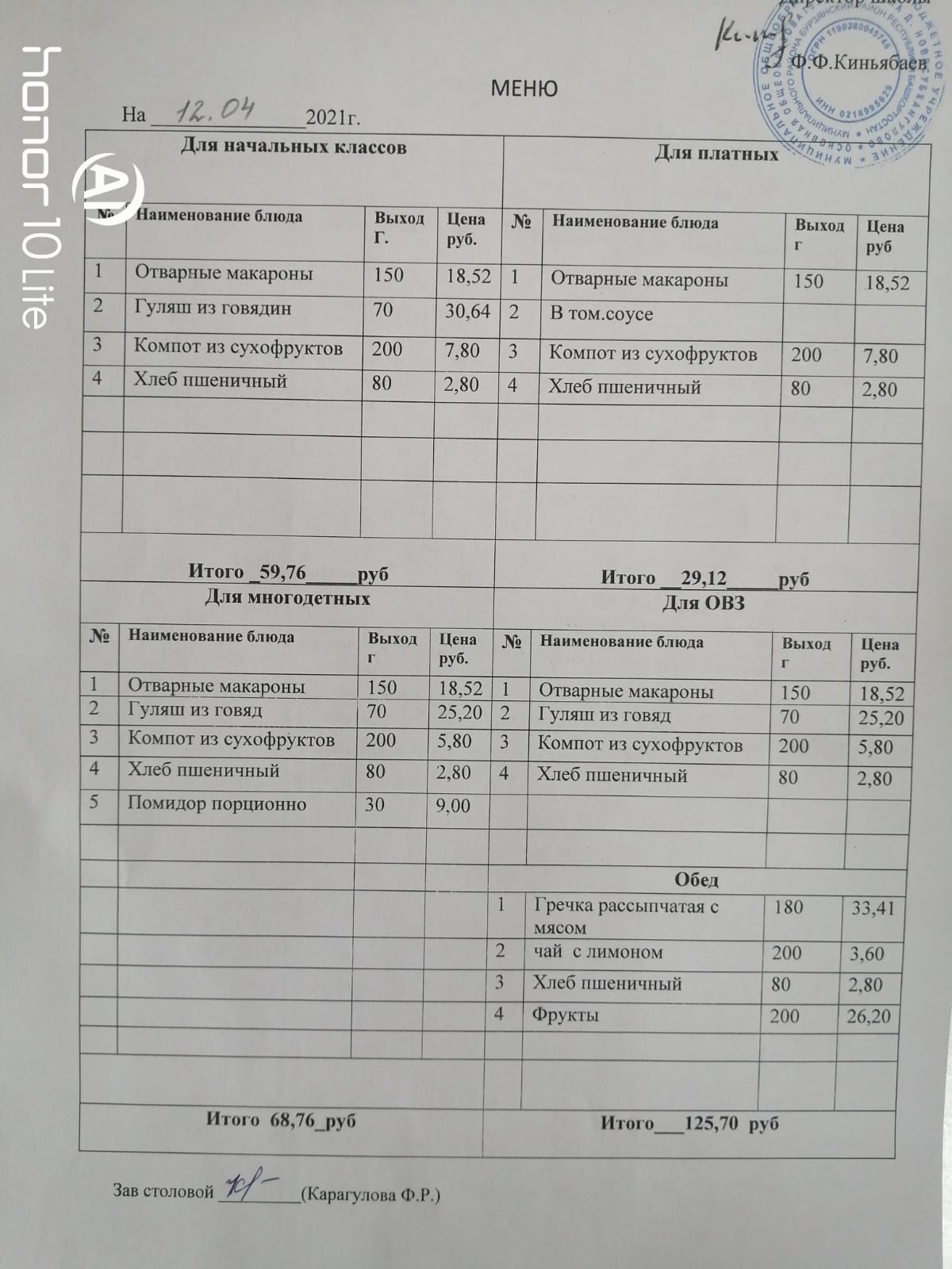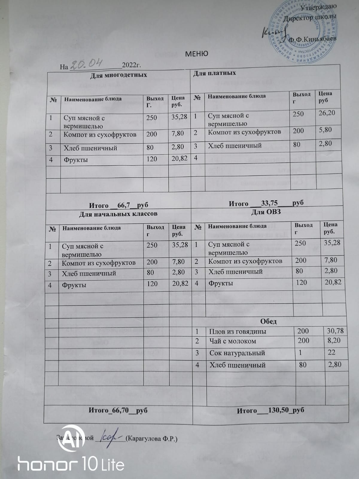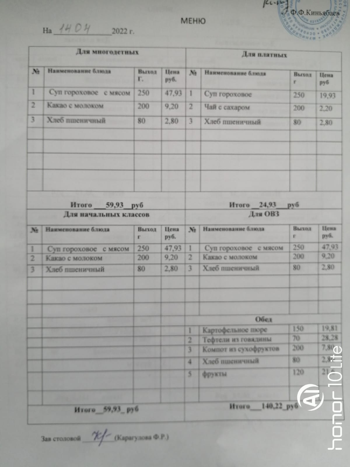 Стоимость школьного питания