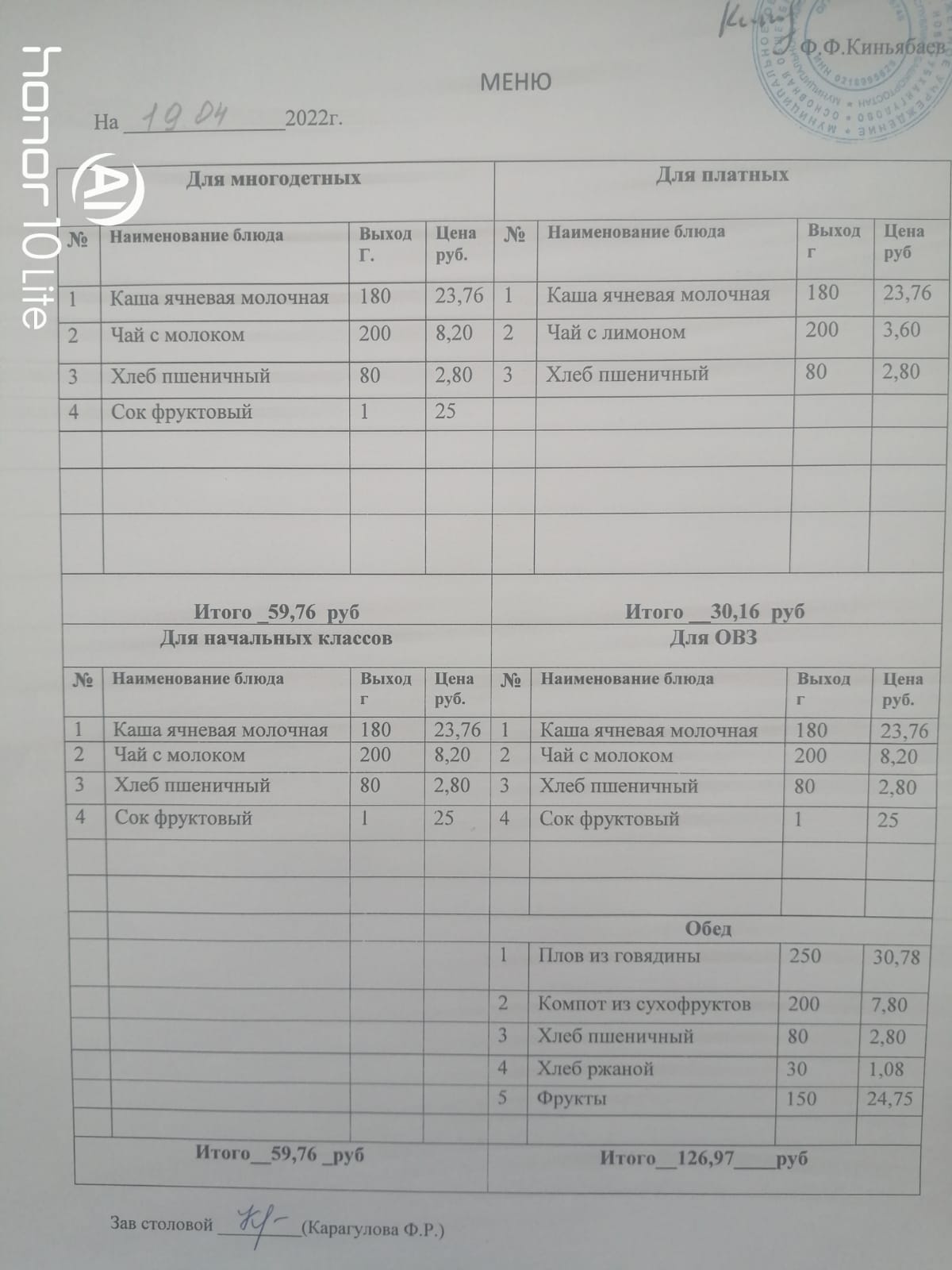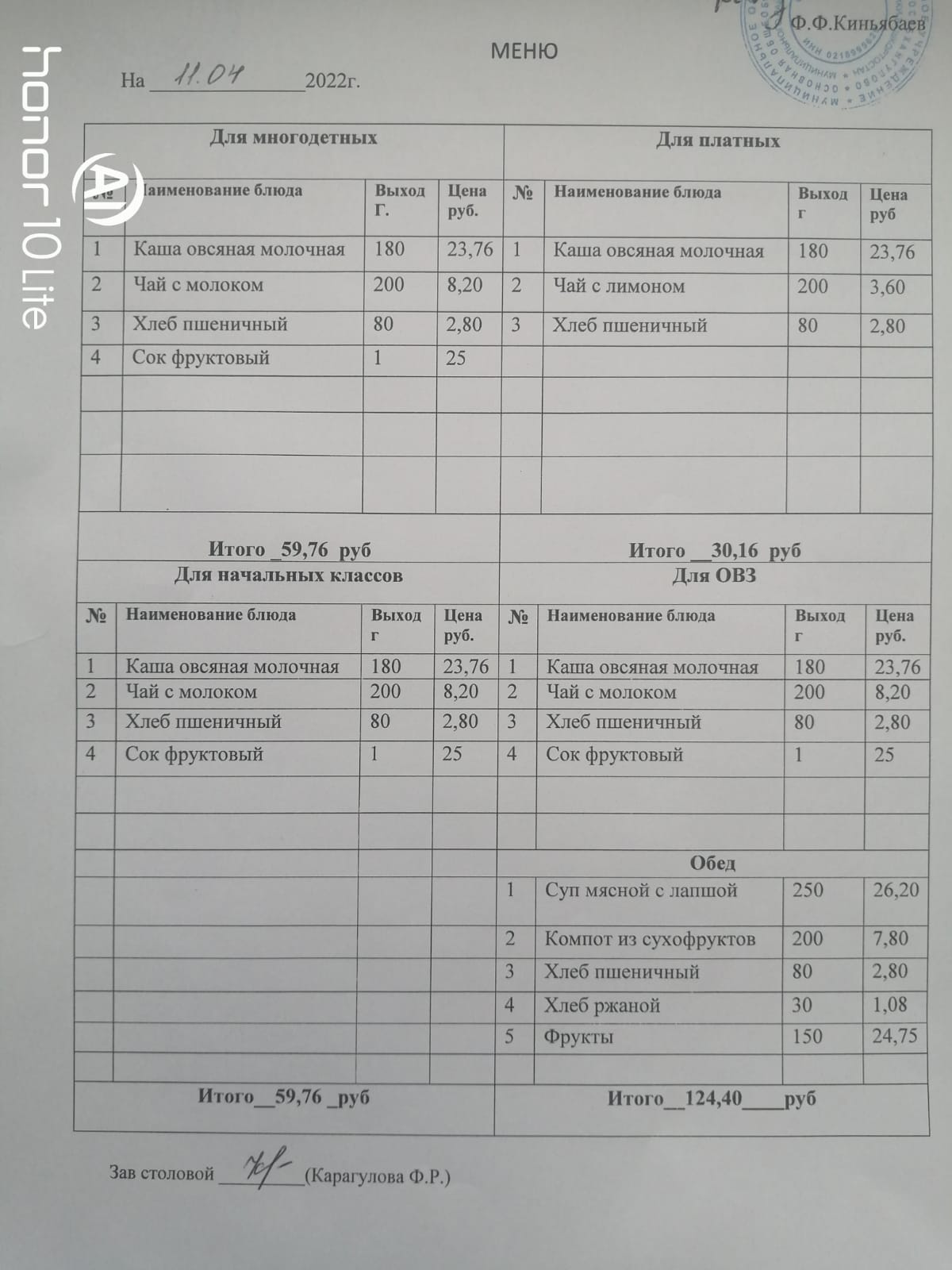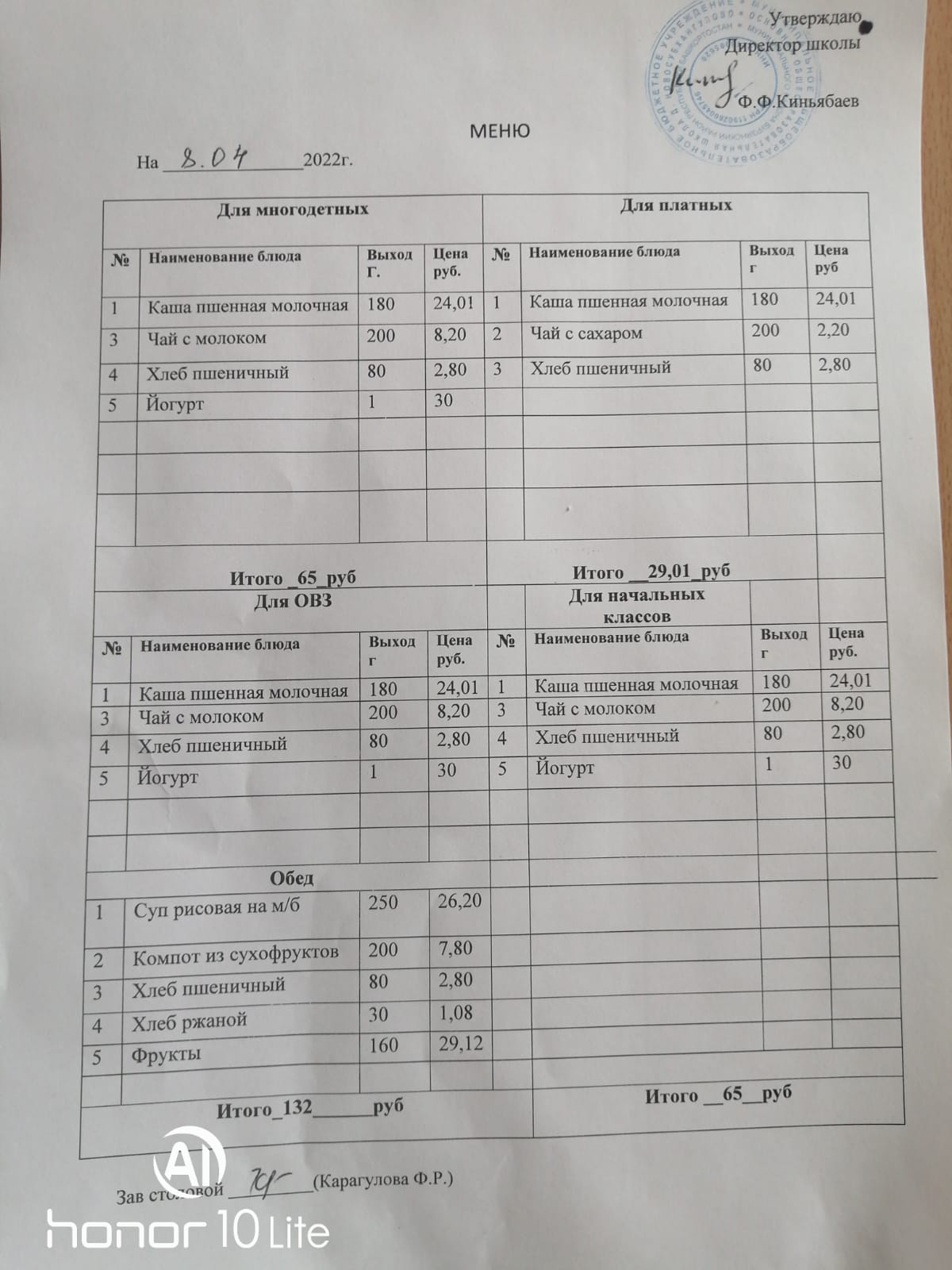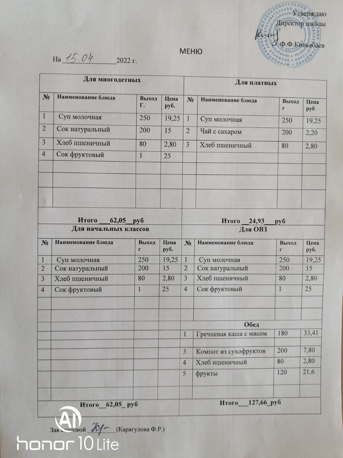 Стоимость школьного питания